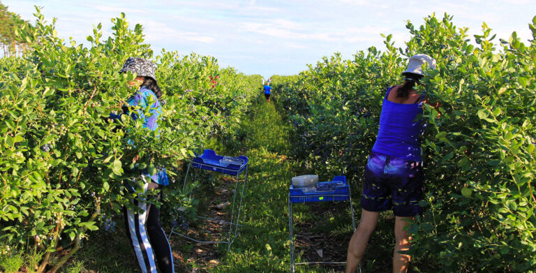 Oferujemy pracę na dużej, nowoczesnej plantacji borówki amerykańskiej. Zatrudniamy pracowników do pracy sezonowej przy zbiorze owoców w okresie lipiec-październik. Zapisy pracowników z zagranicy odbywają się od stycznia (ze względu na wymogi formalne związane z przygotowaniem niezbędnej dokumentacji), natomiast pracowników z Polski od kwietnia.
